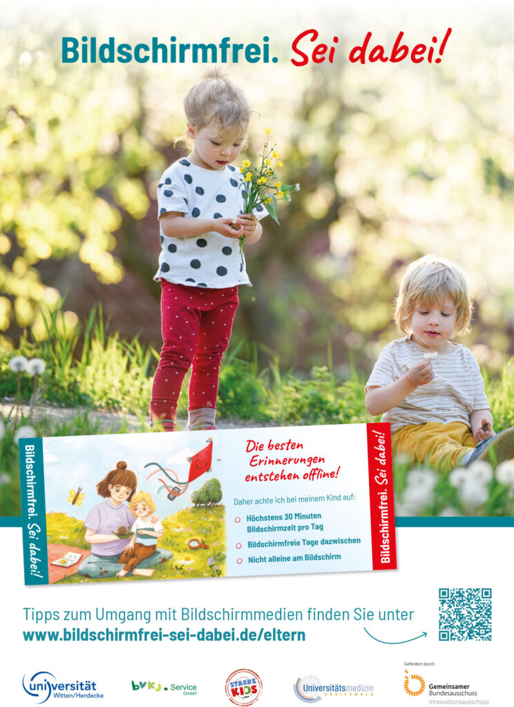 Die Studie „Bildschirmfrei – Sei dabei!“ will Eltern in die Lage versetzen, die Bildschirmmedienzeit ihrer Kinder im Alter von drei bis vier Jahren in einem gesunden Maß zu halten. Dazu wird bei der U7a-Untersuchung ein Signalaufkleber mit den drei wichtigsten Empfehlungen zur Bildschirmmediennutzung durch Kinder in das gelbe Vorsorgeheft (U-Heft) als Verstärkung des ärztlichen Gespräches eingeklebt. Zusätzlich beraten zuvor geschulte Kinder- und Jugendärzt:innen Eltern, deren Kinder eine übermäßige Bildschirmmediennutzung aufweisen, in einem Intensiv-Mediencoaching.